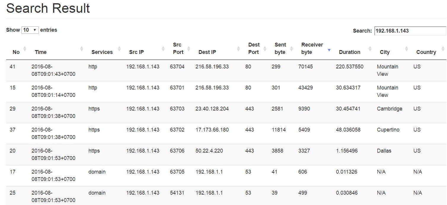 ค่า Duration คือการระยะเวลาทั้งหมดของการสื่อสาร จะพบว่าติดต่อไปที่เครื่อง 220 วินาที นานที่สุดของการใช้งานบนเครื่องนี้ในช่วงเวลาที่ติดต่อไปที่ IP 216.58.196.33