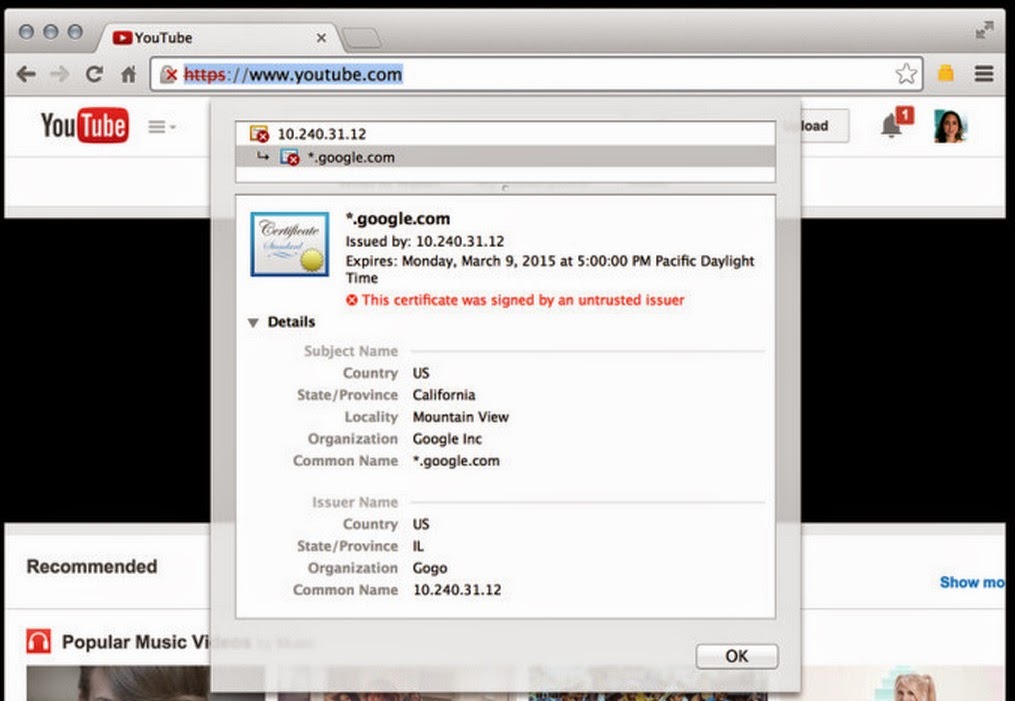 กรณีอย่างนี้เคยเป็นข่าวสำหรับผู้ให้บริการอินเทอร์เน็ตบนสายการบิน ที่ชื่อว่า “gogo” ซึ่งผู้ใช้งานพบว่า youtube.com มี certification ที่ผิดปกติแล้ว capture หน้าจอเป็นข่าวใหญ่ไปช่วงปีใหม่ที่ผ่านมา