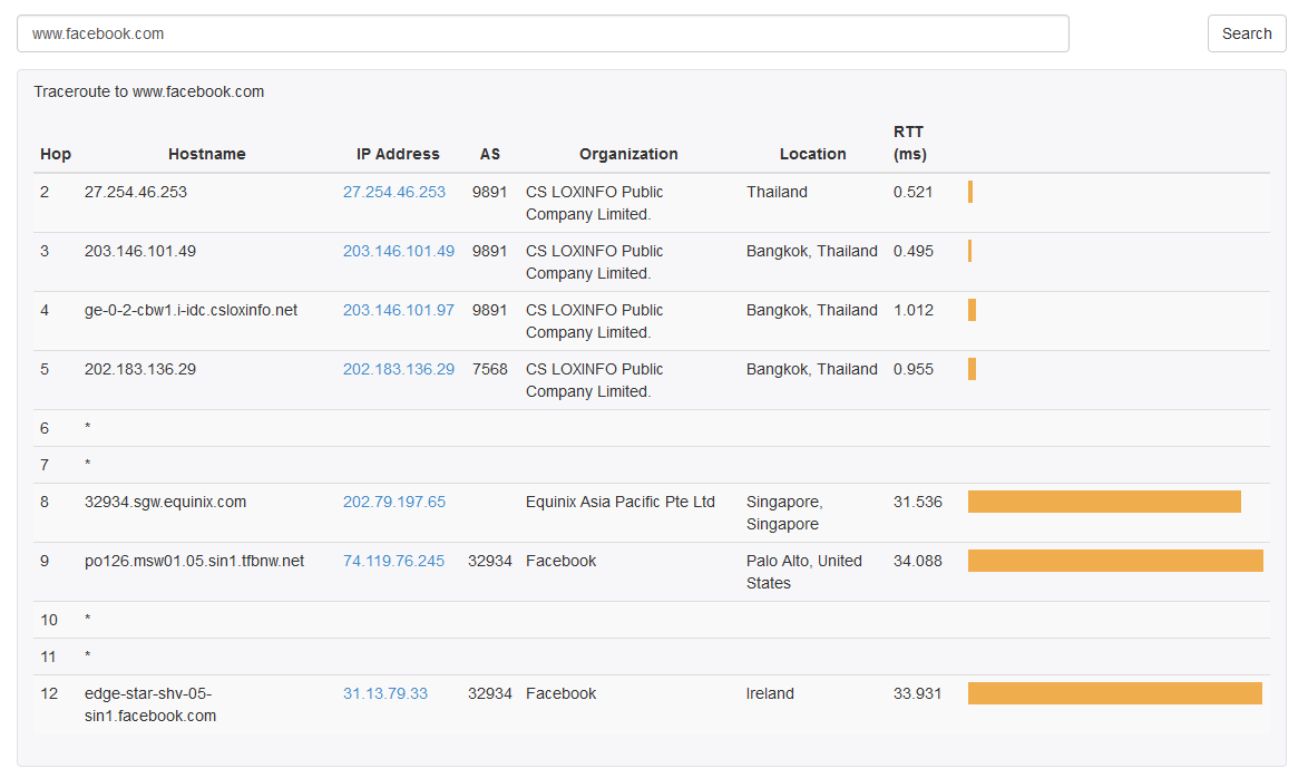 จะพบว่ามีการเริ่มออกจากเครือข่าย True ที่ hop 12 SG-ICR-GS1-10GE.trueintergateway.com โดยมีค่าไอพี 113.21.241.162 จากนั้น hop ที่ 13 xe-7-1-1.pr01.sin1.tfbnw.net ค่าไอพี 103.4.96.29 เป็นเครือข่ายของ Facebook AS32934