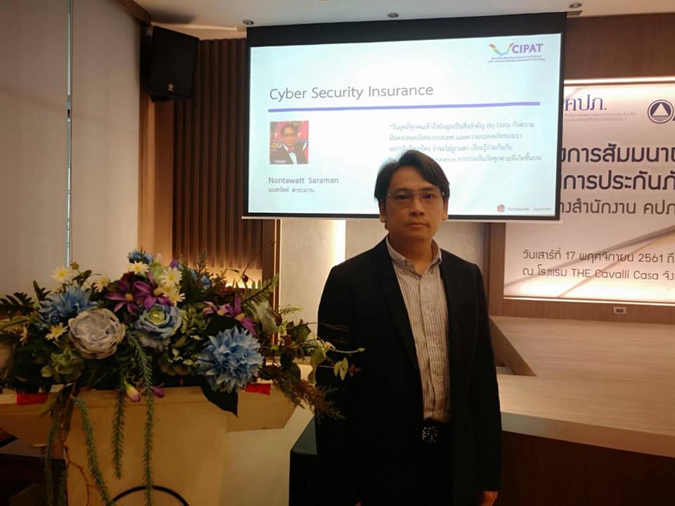เมื่อวันเสาร์ 17 พฤศจิกายน 2561 ที่ผ่านมา คุณ​ นนทวัตต์ สาระมาน นายกสมาคม​คมส่งเสริมนวัตกรรมเทคโนโลยีไซเบอร์ หรือ CIPAT ได้รับเชิญไปบรรยายในโครงการสัมมนาผู้บริหาร สำนักงานคณะกรรมกำกับและส่งเสริมการประกอบธุรกิจประกันภัย (คปภ.) ณ. โรงแรม The Cavalli Casa จ. พระนครศรีอยุธยา ได้บรรยายในหัวข้อเรื่อง “Cyber Security of Insurance” ให้แก่คณะผู้บริหารประกันภัยฯ เพื่อให้เป็นไปตามนโยบายของ สำนักงาน คปภ.และธุรกิจประกันวินาศภัย โดยมีวัตถุประสงค์เพื่อเพิ่มพูนความรู้เกี่ยวกับการดำเดินธุรกิจประกันวินาศภัยในสถานการณ์ปัจจุบัน และเพื่อให้ผู้ปฏิบัติงานมีความรู้ความเข้าใจและให้ปฏิบัติงานไปในทิศทางเดียวกันและทั้งยังเป็นการสร้างความสัมพันธ์อันดีระหว่างผู้บริหารจากสำนักงาน คปภ.ทั้งส่วนกลางและส่วนภูมิภาคทุกจังหวัดทั่วประเทศ